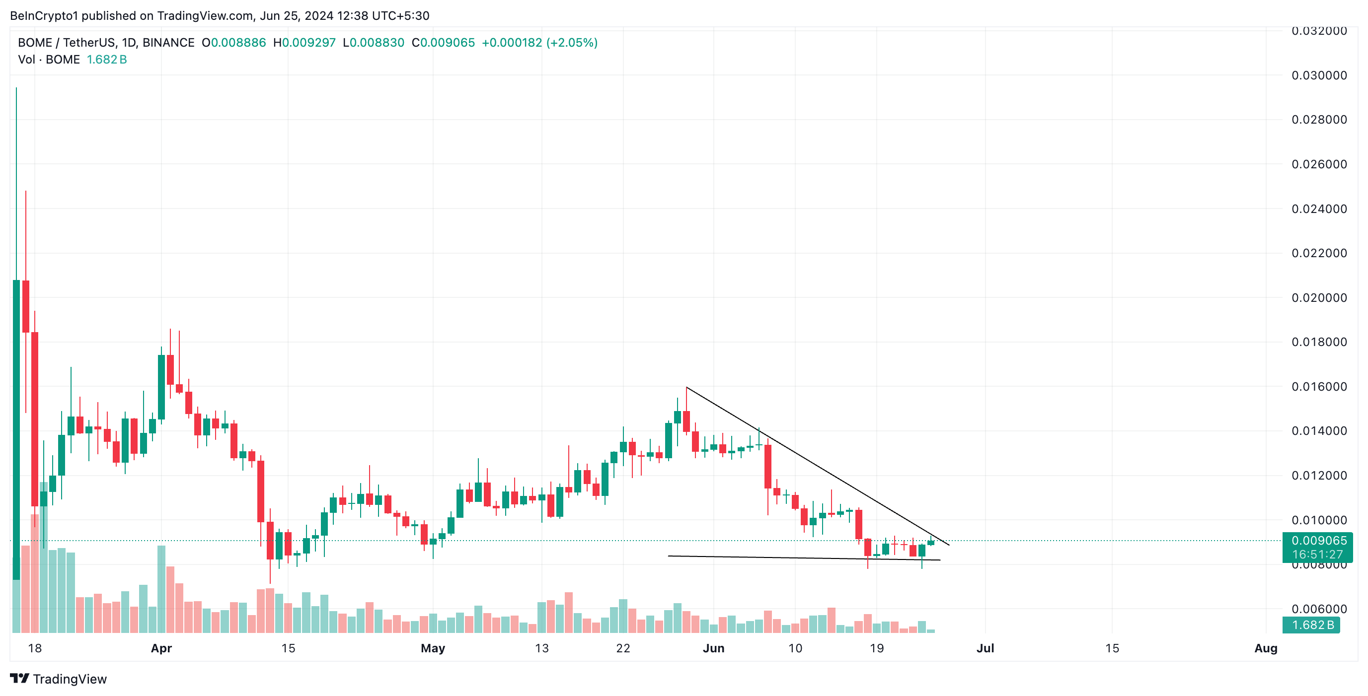 Na een lange periode van koersdaling, gekenmerkt door de vorming van een dalende driehoek, is de populaire meme coin Book Of Meme (BOME) begonnen aan een opleving.