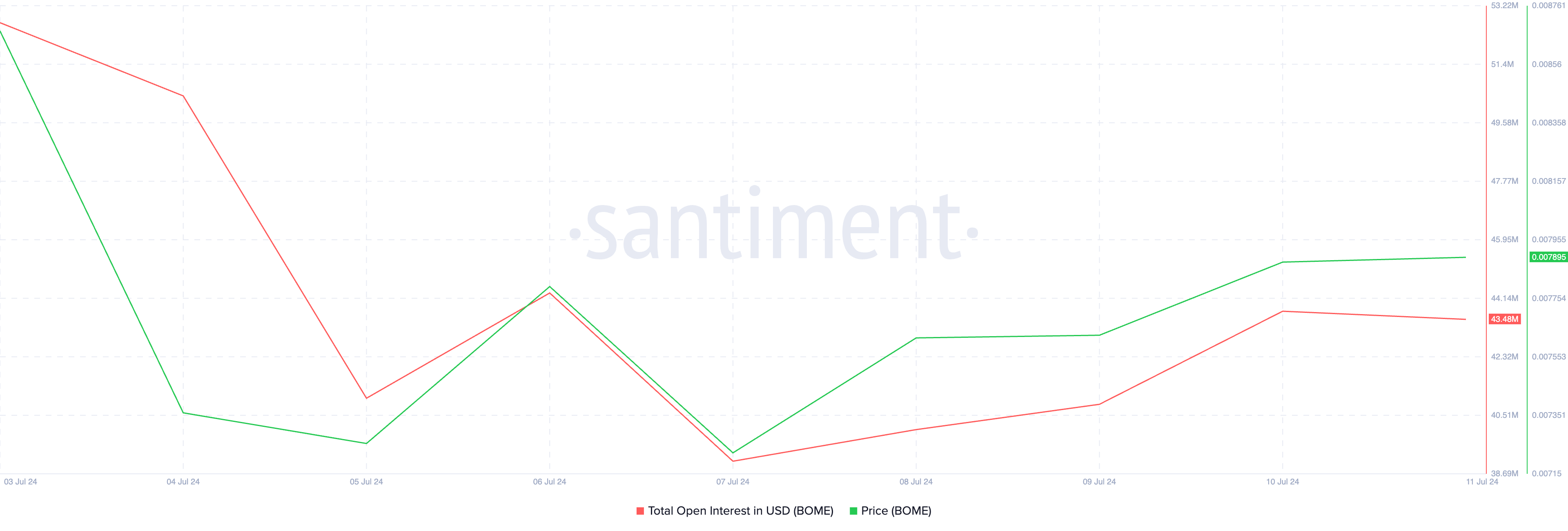 De open interest van de populaire Solana meme coin Book of Meme (BOME) daalde naar een vier-maandelijkse low van $39 miljoen op 7 juli.