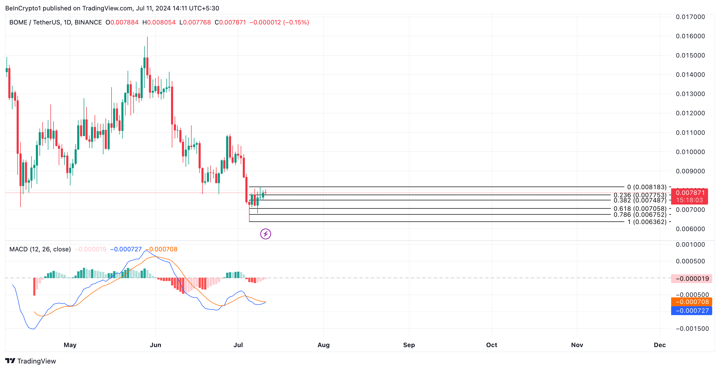 Een beoordeling van BOME’s Moving Average Convergence Divergence (MACD) op een eendaagse grafiek onthult een mogelijke bullish crossover.
