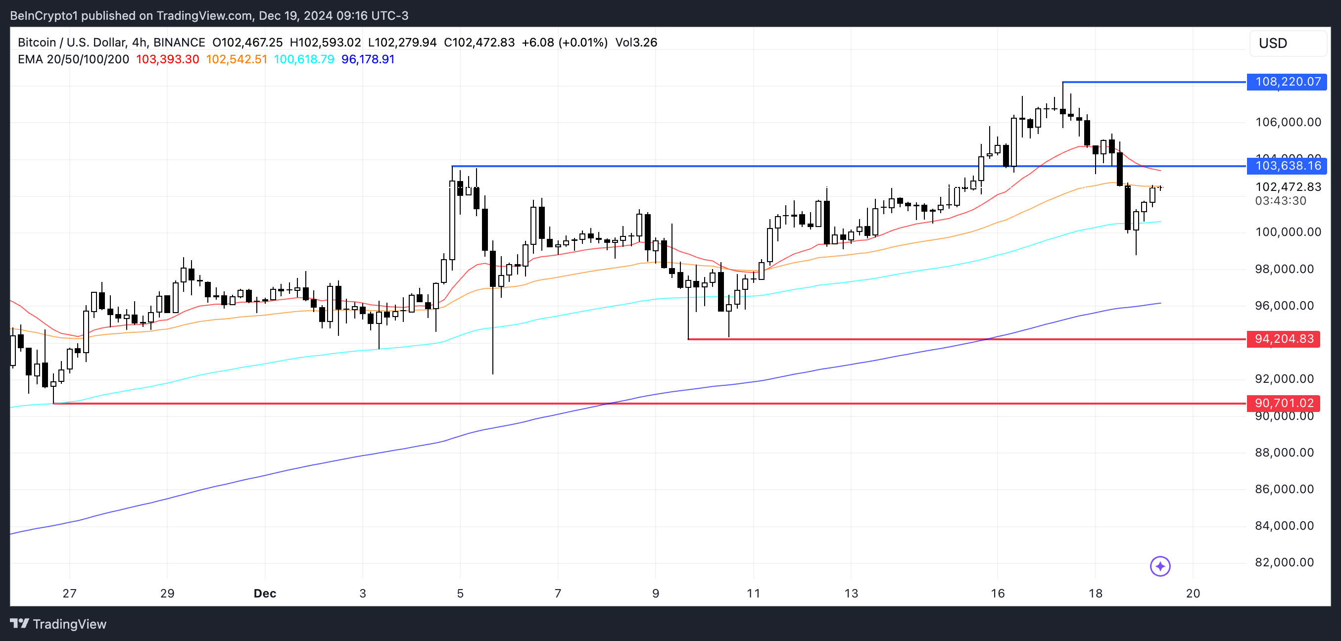 In dit scenario zou de BTC koers het $94.000-steunniveau kunnen testen, en als dat niet standhoudt, kunnen de prijzen verder dalen naar $90.000, wat een mogelijke correctie van 11,7% vanaf de huidige niveaus vertegenwoordigt.