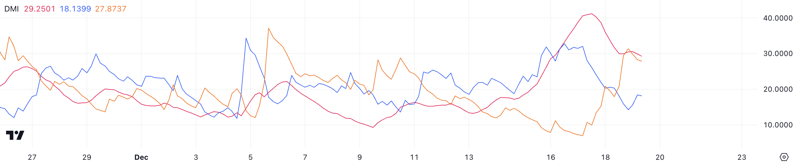 De Bitcoin DMI-grafiek laat zien dat de ADX momenteel op 29,2 staat, aanzienlijk gedaald van boven de 40 slechts twee dagen geleden toen Bitcoin een nieuwe all-time high bereikte. Deze daling in ADX geeft aan dat hoewel de trend relatief sterk blijft, de intensiteit afneemt.