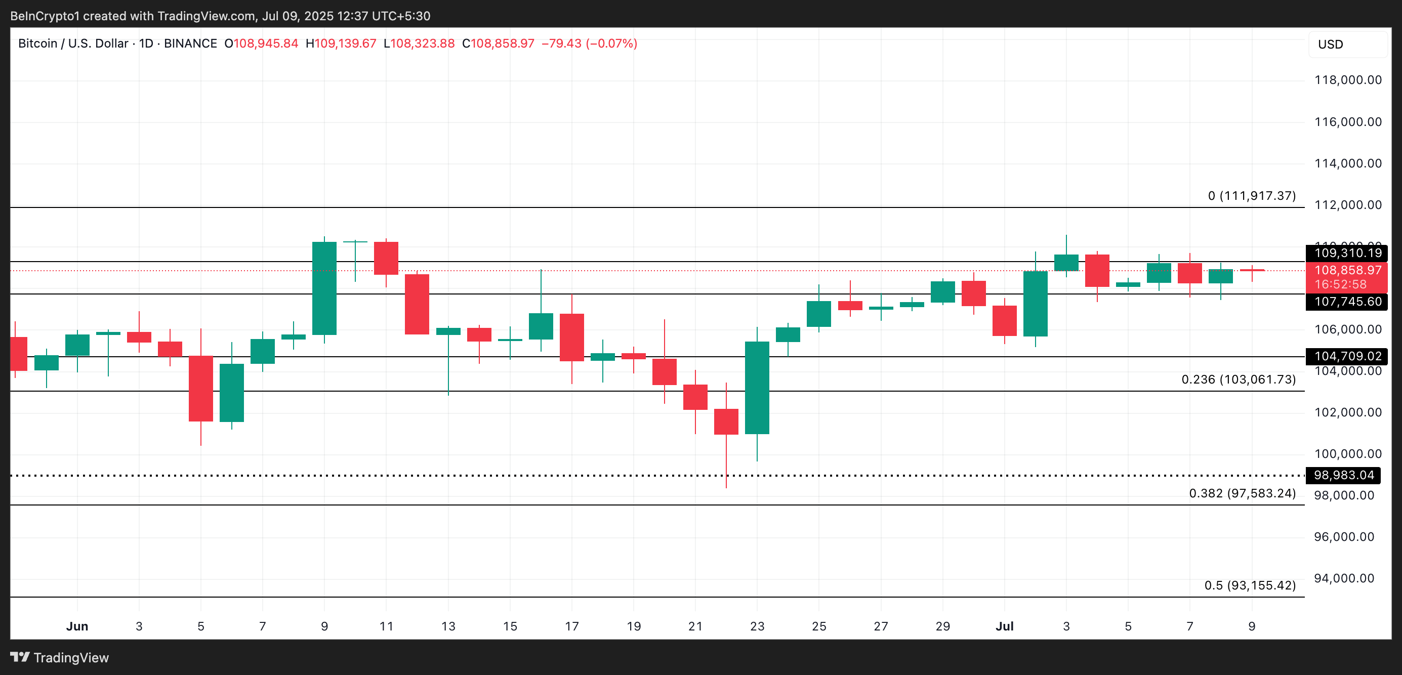 BTC koers kan de steun doorbreken en dalen naar $104.709 als de koopdruk zwak blijft.