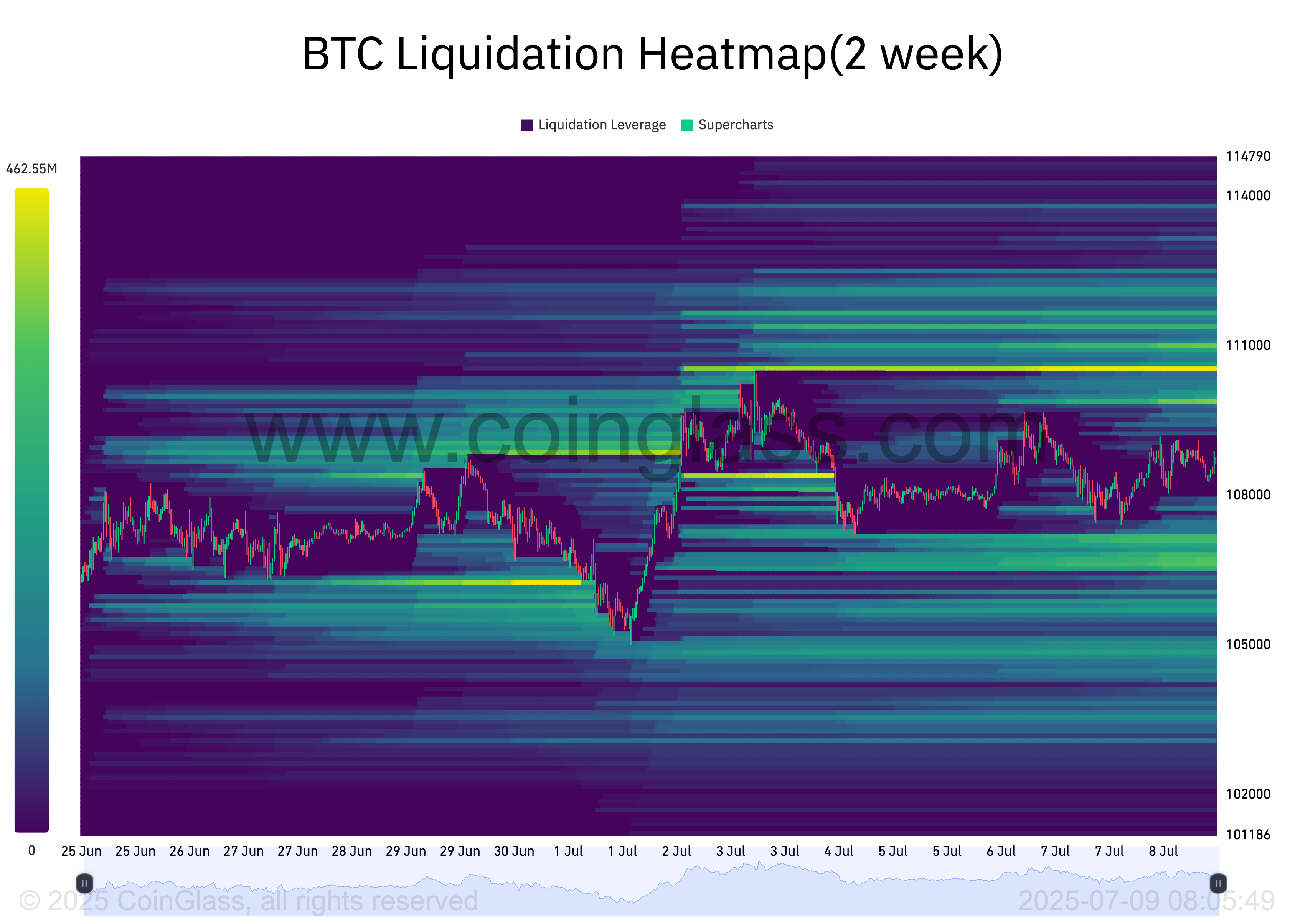 Een beoordeling van de BTC-liquidatie-heatmap toont een opmerkelijke concentratie van liquiditeit rond de $110.473-koerszone.