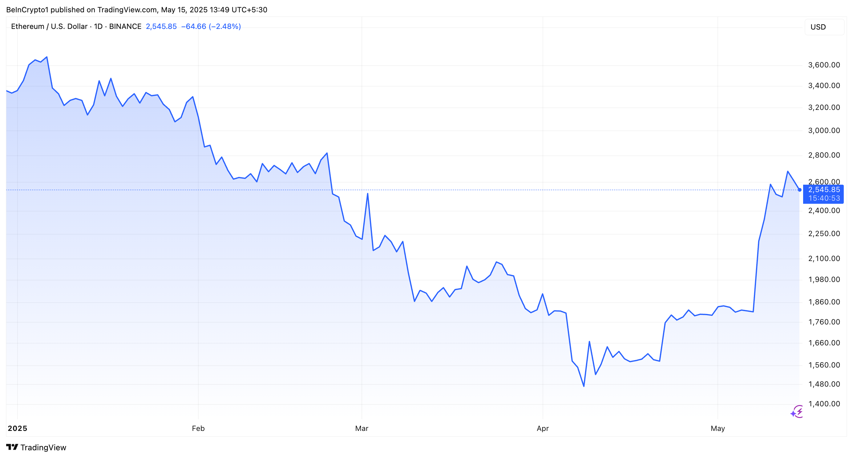 Bovendien steeg de koers ook naar twee-maandse highs, maar een bescheiden correctie volgde. Volgens BeInCrypto-gegevens is ETH de afgelopen dag met 3,8% gedaald. Op het moment van schrijven werd het verhandeld op $2.545.