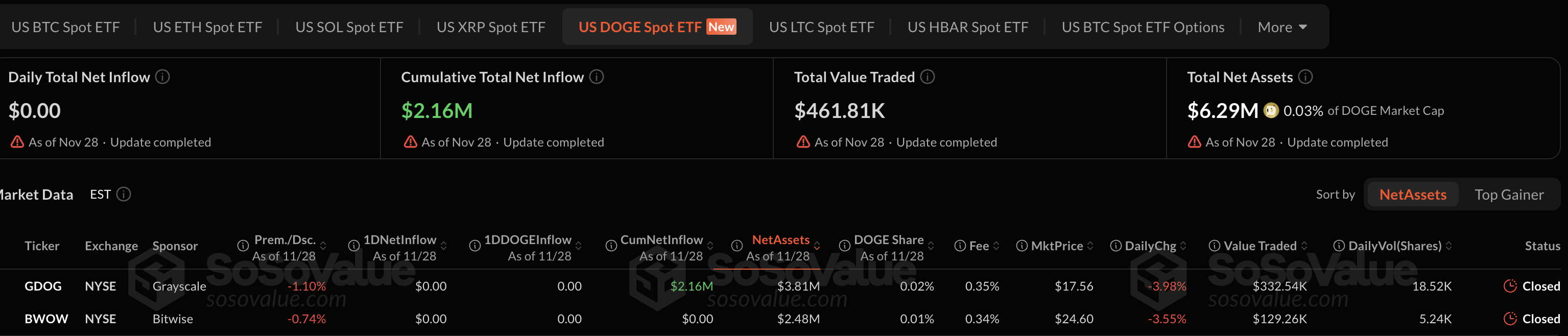SponsoredIn november zijn er twee DOGE spot-producten gelanceerd— Grayscale’s ETP (GDOG) en Bitwise’s ETF (BWOW). Maar de instromen blijven zwak. Grayscale heeft ongeveer $2,16 miljoen aan cumulatieve instroom, terwijl Bitwise nog steeds op nul staat, wat tot nu toe beperkte vraag signaleert.