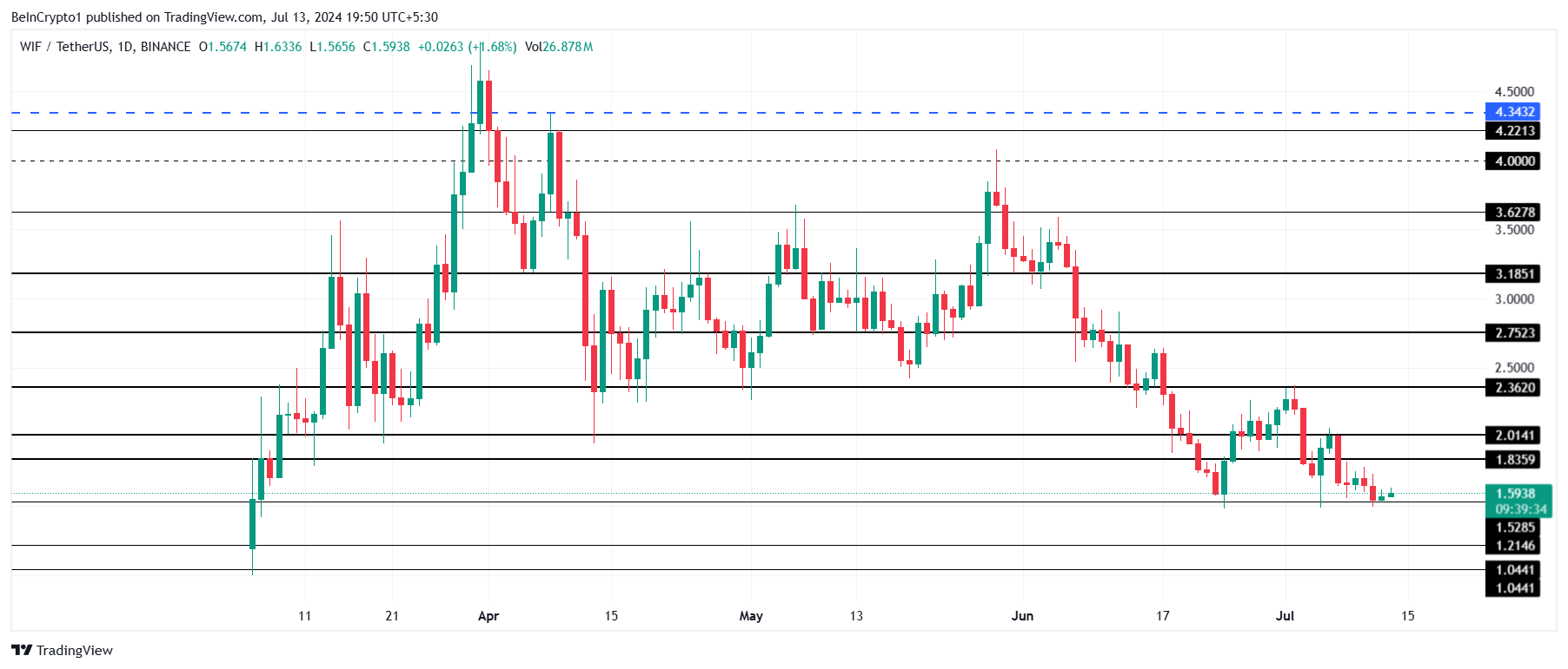 De koers van WIF kijkt naar een potentieel herstel na het stuiteren van de steun op $1,52. Momenteel wisselt de munt van eigenaar op $1,59, de volgende weerstand ligt op $1,83. De kans dat investeerders de meme coin naar deze barrière duwen is high, gezien de bullish signalen op het netwerk.