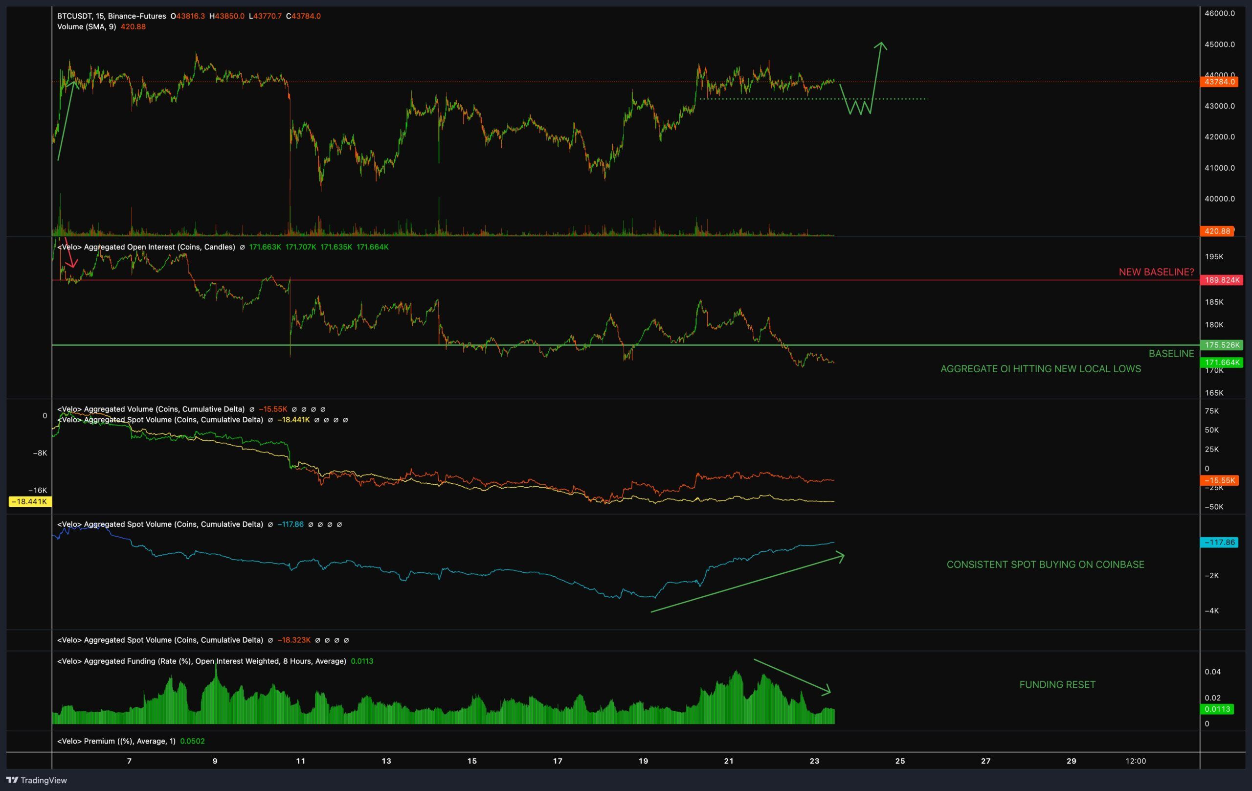 Voor zijn redenering wees hij op de toename van spotaankopen op Coinbase, de reset van funding en de afname van de open interest.