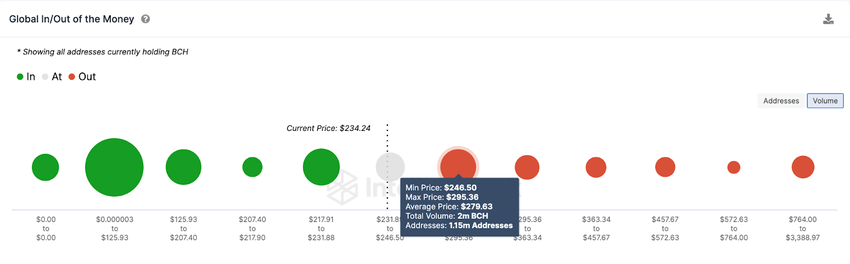 Als de bullish whales de negatieve commentaren in de sociale media negeren, zou de aanhoudende prijsrally van Bitcoin Cash $300 kunnen bereiken. De Global In/Out of Money Around Price (GIOM) data, die de verdeling van de instapprijzen van huidige investeerders in BCH laat zien, bevestigt ook deze voorspelling.