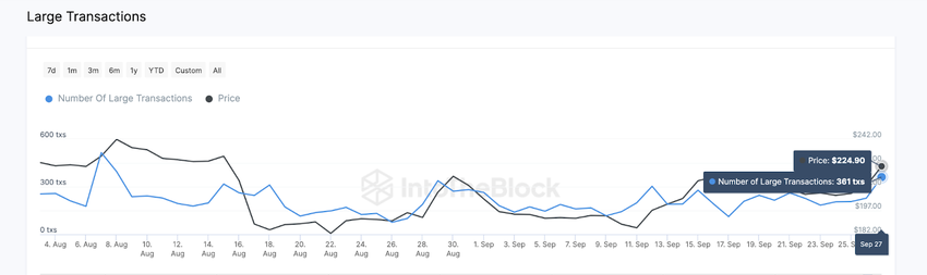 De metriek voor grote transacties verzamelt het totale aantal bevestigde transacties van meer dan $100.000 op een bepaalde handelsdag. Doorgaans interpreteren strategische investeerders een toename in grote transacties als een belangrijk bullish signaal.