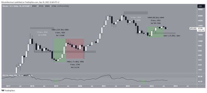 De voortdurende daling van BTC sinds de all-time high van november 2021 lijkt veel op de daling na de high van 2017. Tijdens beide Bitcoin cyclussen werden de bodems na 12 maanden bereikt. Bovendien markeerden ze een tijdelijke RSI daling onder de 50 (groene cirkel) vóór de stijging boven 50.