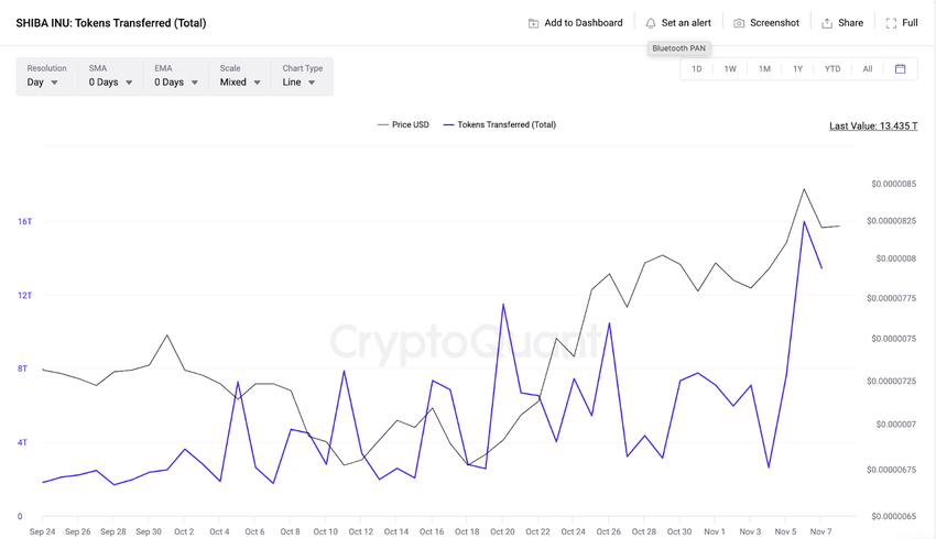 Shiba Inu holders hebben hun transactieactiviteit de afgelopen week sterk verhoogd. Zoals hieronder weergegeven, overschreed SHIB Tokens Transferred 15,9 biljoen op 6 november, wat het hoogste niveau van economische activiteit sinds augustus markeert.