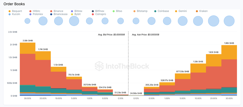 De samengevoegde orderboeken is een andere belangrijke on-chain grafiek die momenteel wijst op een toename van de vraag naar SHIB. Zoals hieronder afgebeeld, hebben SHIB traders actieve kooporders geplaatst voor 6,8 biljoen tokens. Dit is aanzienlijk hoger dan de 6,5 biljoen SHIB verkooporders die momenteel genoteerd staan op cryptobeurzen.