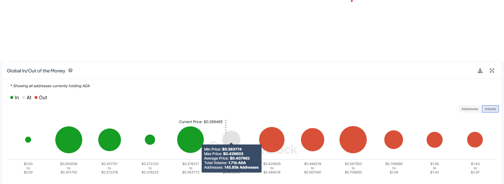 Dit zou ook een stijging van de winsten van de investeerders betekenen. Volgens de Global In/Out of the Money (GIOM) metriek wordt ADA geconfronteerd met verliezen van ongeveer 1,7 miljard ADA. Gekocht tussen $0,39 en $0,42, zou dit aanbod van $683 miljoen de markt aanzienlijk kunnen beĂŻnvloeden.