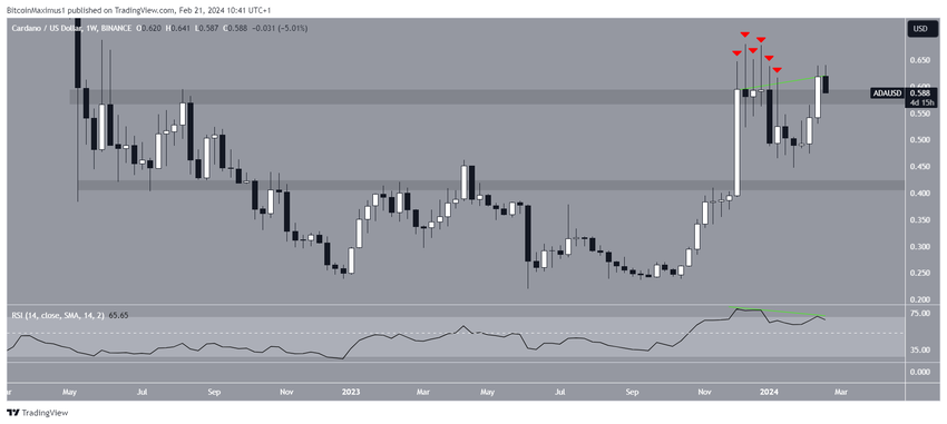 De analyse van de wekelijkse tijdframe laat zien dat de koers van ADA sinds september 2023 is gestegen. De opwaartse beweging culmineerde in december in een high van $0,68, een nieuwe high op jaarbasis.