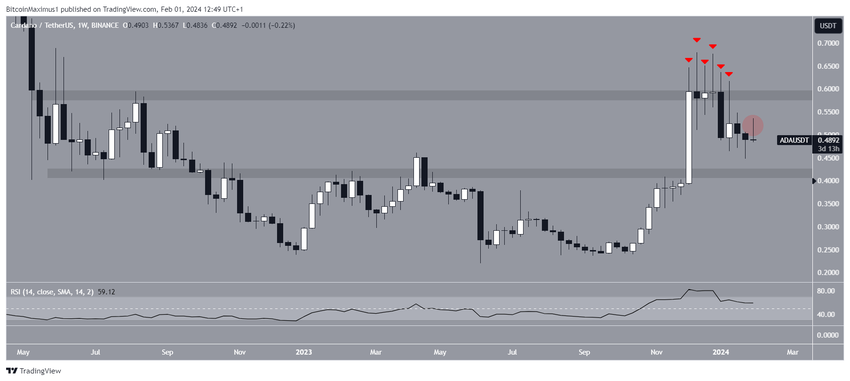 De technische analyse van het wekelijkse tijdframe laat zien dat ADA sinds november 2023 zes mislukte breakout-pogingen heeft gedaan boven een horizontaal weerstandsgebied op de lange termijn. Deze creëerden allemaal lange bovenste wicks (rode pijlen), die worden beschouwd als tekenen van verkoopdruk.