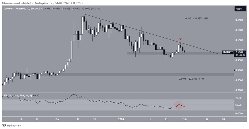 De koersactie laat zien dat ADA sinds 14 december 2023 is gedaald onder een dalende weerstandstrendlijn. Meer recentelijk verwierp de trendlijn de koers op 30 januari (rode pijl).