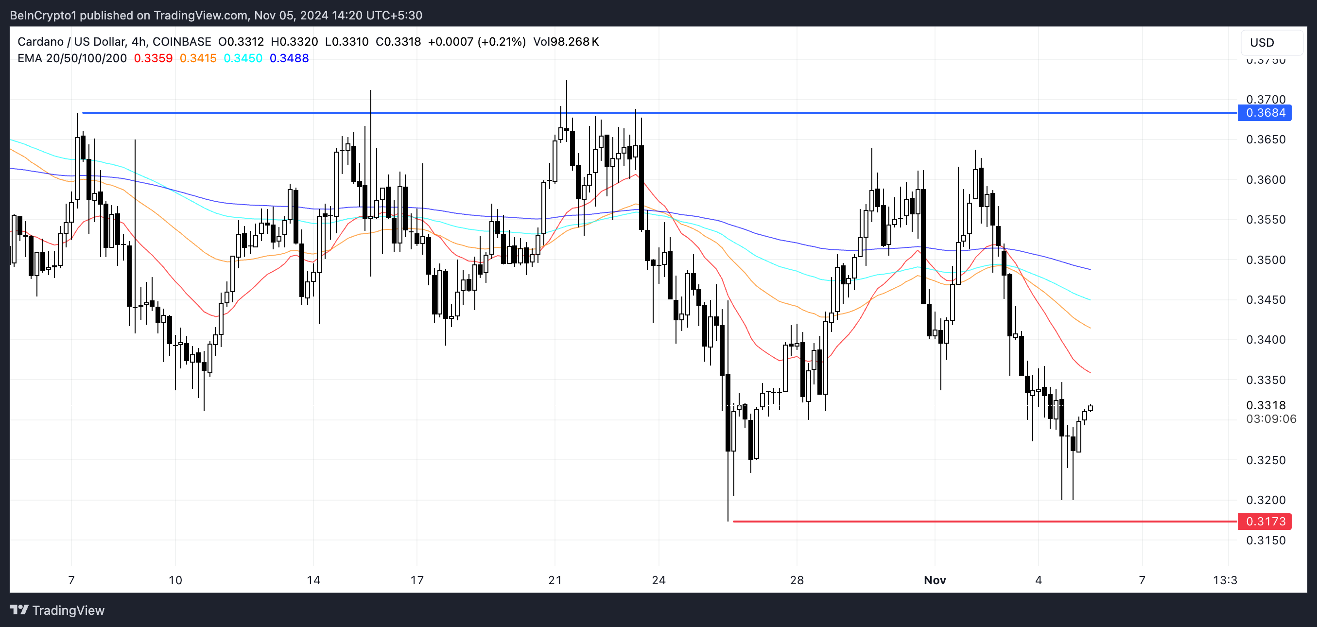Als deze downtrend aanhoudt, kan de ADA koers binnenkort zijn steunniveau op $0,31 testen, en als het bearish momentum sterk blijft, kan deze verder dalen.