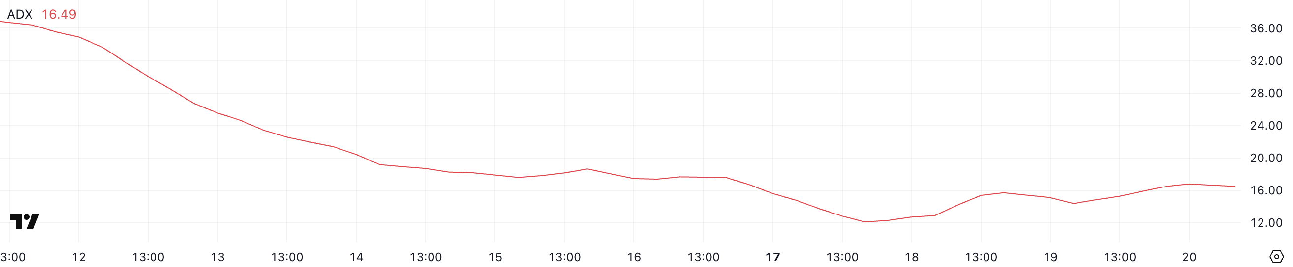 De trendsterkte van Cardano is relatief onveranderd gebleven, met de ADX momenteel op 16,49 – ongeveer hetzelfde niveau als gisteren.