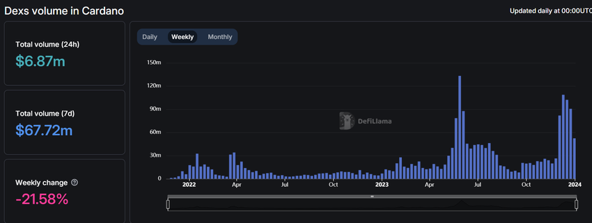 • Toch ervaart het gedecentraliseerde financiële (DeFi) ecosysteem van Cardano een merkbare daling in betrokkenheid.