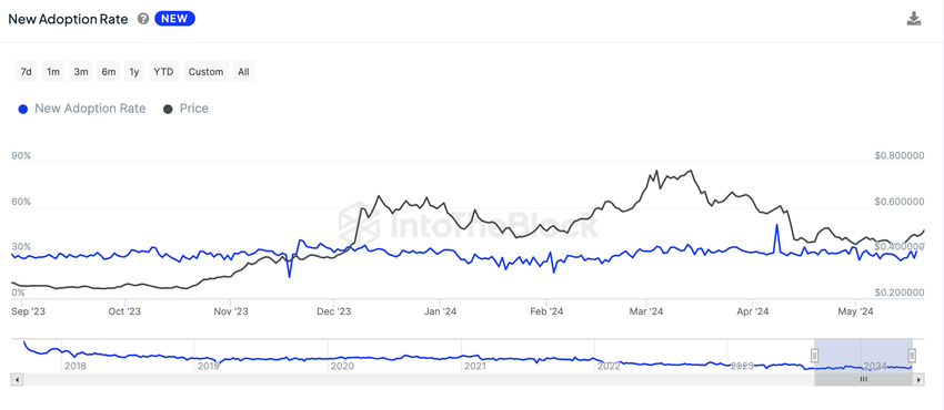 De adoptiegraad van ADA vertoont positieve trends. Ondanks schommelingen in de koers suggereert de consistente toename van nieuwe adressen een gezonde instroom van nieuwe gebruikers. Dit is een positief teken voor de groei op lange termijn en de stabiliteit van het Cardano-netwerk.
