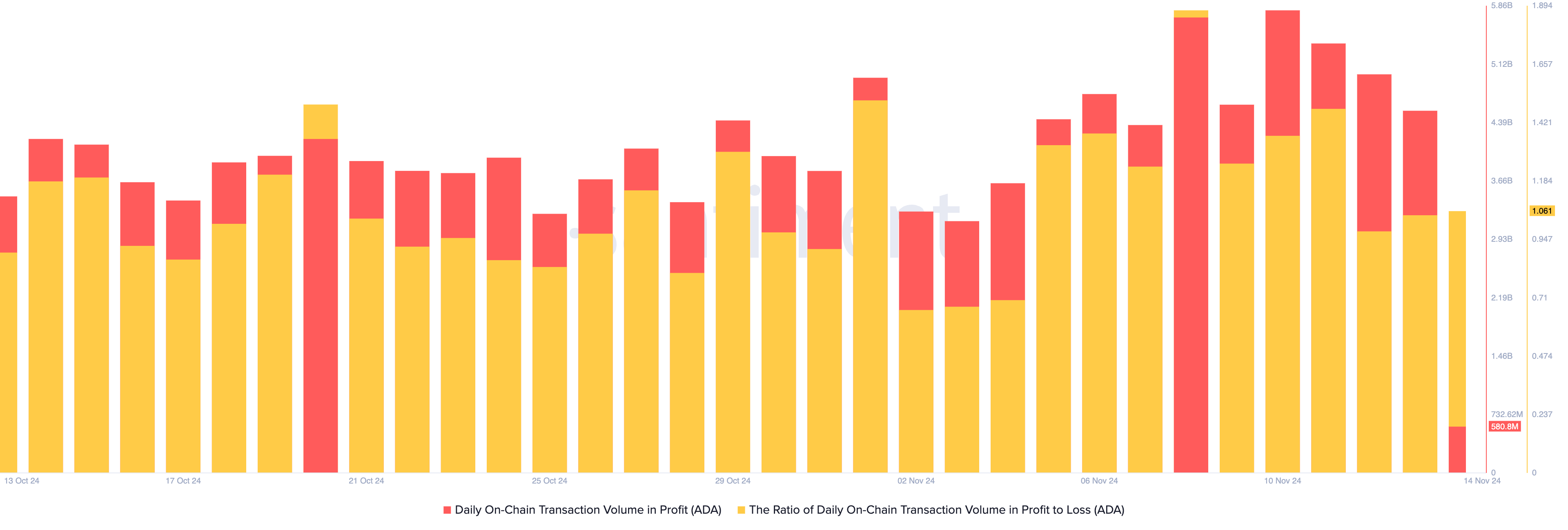 Op 13 november bedroeg dit totaal 5 miljard. Die dag was de verhouding van het dagelijkse on-chain transactievolume in winst ten opzichte van verlies 1,04, wat aangeeft dat voor elke ADA-transactie die met verlies eindigt, 1,04 transacties winst opleveren.
