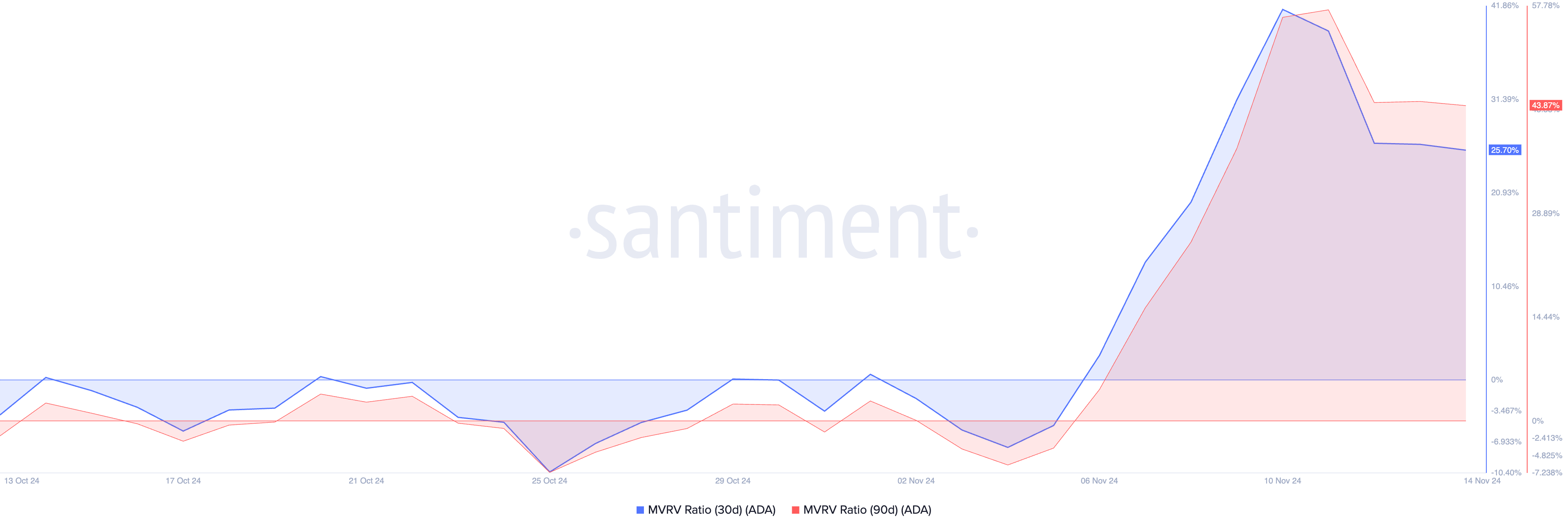 De marktwaarde tot gerealiseerde waarde (MVRV) ratio van Cardano, die de algehele winstgevendheid van al zijn houders meet, heeft de afgelopen zeven dagen alleen positieve waarden laten zien. Volgens gegevens van Santiment zijn de MVRV-ratio’s van 30 dagen en 90 dagen van de altcoin respectievelijk 25,70% en 43,87%.