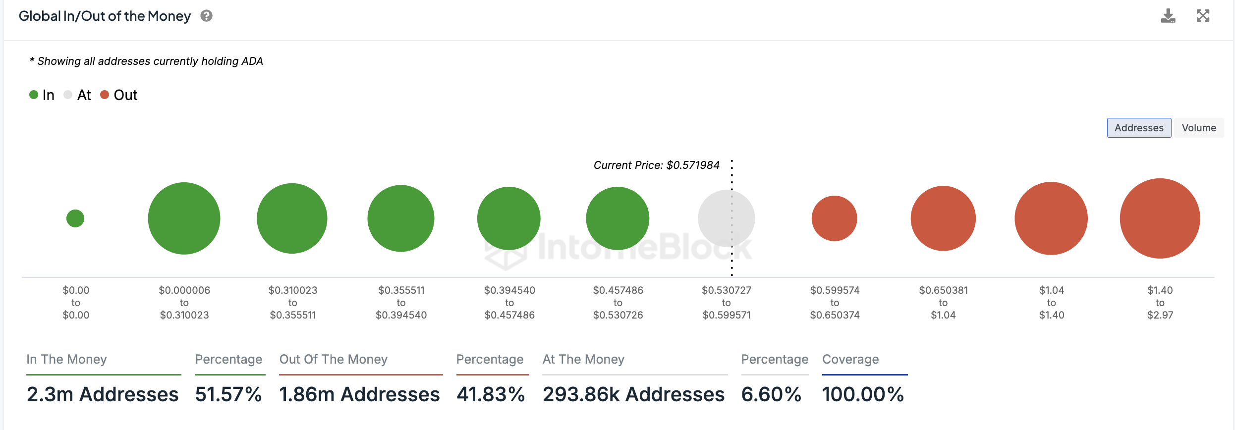 Opvallend is dat volgens IntoTheBlock, door de prijsstijging, momenteel 52% van alle adressen die Cardano bezitten “in het geld” zijn. Dit betekent dat 2,3 miljoen adressen winstgevend zouden zijn als ze hun munten tegen de huidige marktprijs zouden verkopen. Daarentegen zitten 41,3% van alle Cardano-houders, bestaande uit 1,86 miljoen adressen, “uit het geld”, dat wil zeggen dat ze op ongerealiseerde verliezen zitten.
