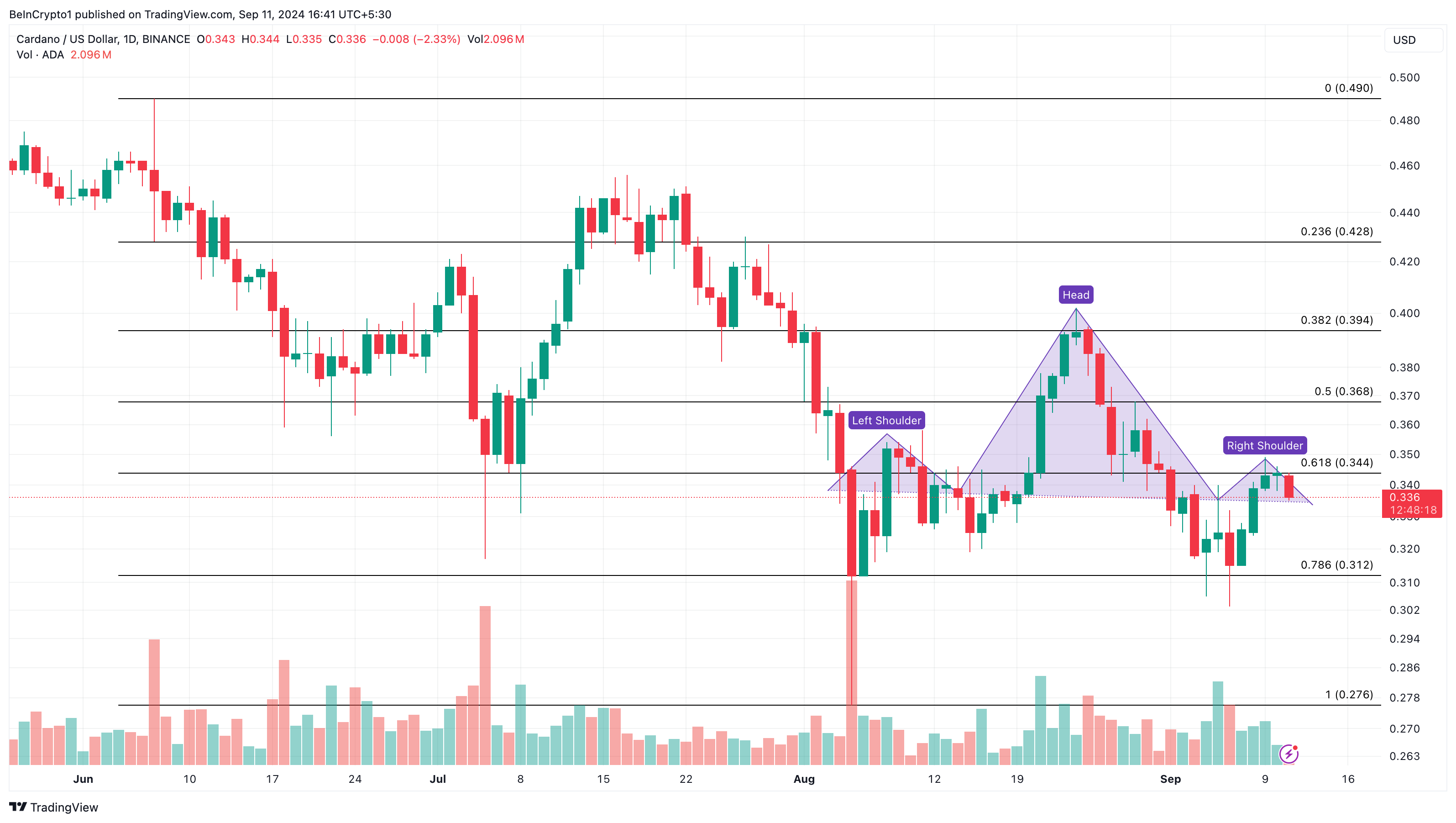 Opvallend is dat dit patroon suggereert dat de neerwaartse trend kan aanhouden. Volgens de Fibonacci retracement-indicator kan de Cardano koers dalen naar $0,31. Echter, als er een bredere marktherstel plaatsvindt samen met sterke accumulatie, kan de trend omkeren, wat mogelijk de koers van ADA naar $0,39 kan brengen.
