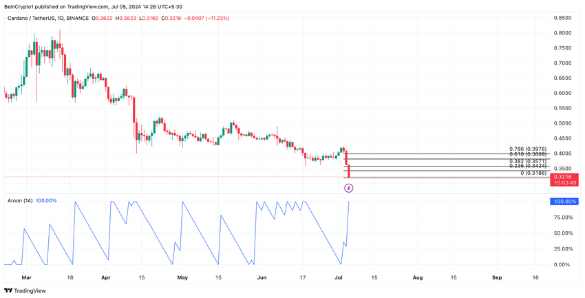 ADA zit sinds begin juli in een neerwaartse trend. Tegen de huidige koers handelt de altcoin op een low die voor het laatst werd gezien in november 2023.