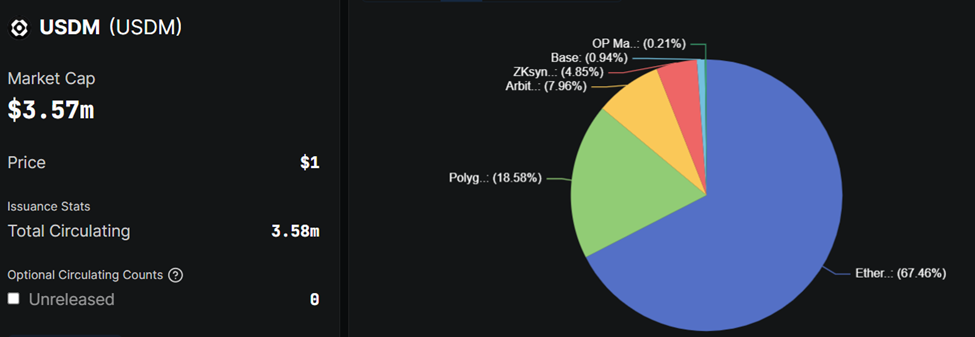 De uitrol van USDM is momenteel geconcentreerd op Ethereum (67,46%), Polygon (18,58%) en Arbitrum (7,96%). USDM heeft ook een beperkte multichain-aanwezigheid vergeleken met de brede reikwijdte van USDC.