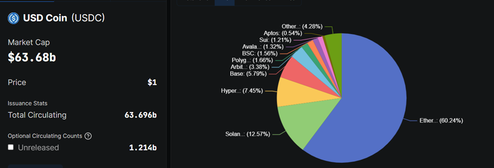 De stablecoin van Circle wordt uitgegeven over een breed scala aan netwerken, waaronder Ethereum (60,24%), Solana (12,57%), Base (5,79%) en Hyperliquid (7,45%). Momenteel circuleert er meer dan 63,7 miljard tokens.