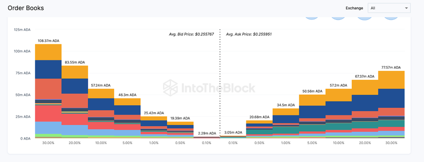 De grafiek hieronder laat zien dat binnen de +/-10% grenzen van de huidige ADA-prijs, de verkooporders aanzienlijk zwaarder wegen dan de kooporders. Concreet willen de bearish traders 166 miljoen ADA verkopen tegen de 150 miljoen ADA kooporders van de bull.