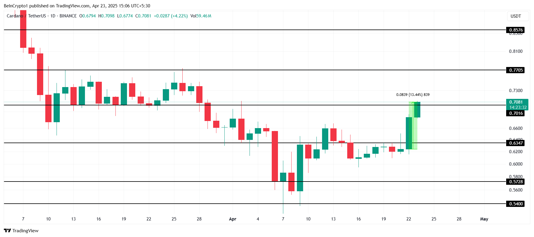 Cardano koers handelt momenteel op $0,70, wat een stijging van 13% in de afgelopen 24 uur markeert. Als deze bullish trend aanhoudt, zal ADA waarschijnlijk weerstand ondervinden rond $0,77. Historisch gezien is de range van $0,70 tot $0,77 een consolidatiezone geweest. Een succesvolle doorbraak van $0,77 zou een beweging richting $0,85 kunnen betekenen.