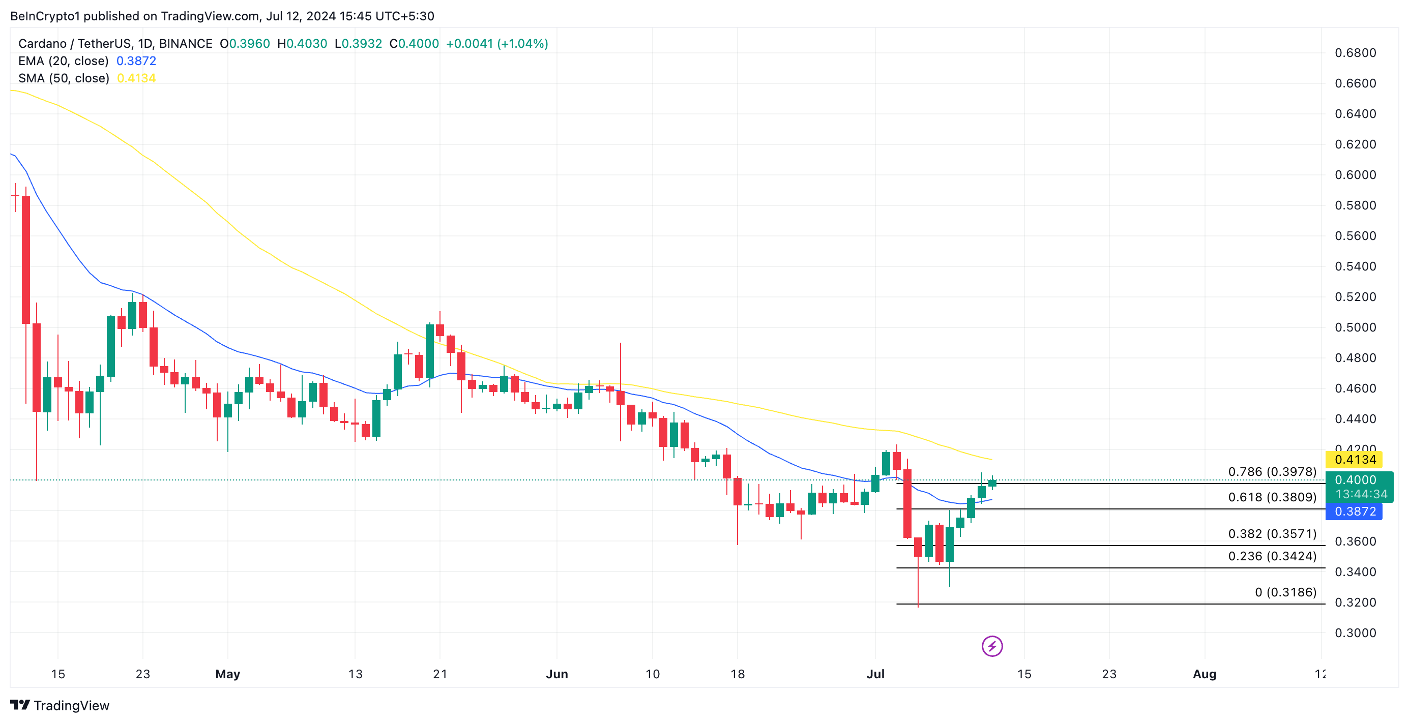 Als dit gebeurt, zal ADA handelen boven $0,41.