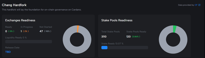 De hard fork zal echter alleen doorgaan als 70% van de validators, of Stake Pool Operators (SPO’s), upgraden naar de nieuwe node. Op het moment van schrijven meldt Cardanoscan dat slechts ongeveer 3% van de 3.110 stake pools van het netwerk klaar is voor de hard fork. De definitieve datum voor de hard fork zal dus worden vastgesteld zodra de community de vereiste SPO en Exchange readiness drempels heeft gehaald.