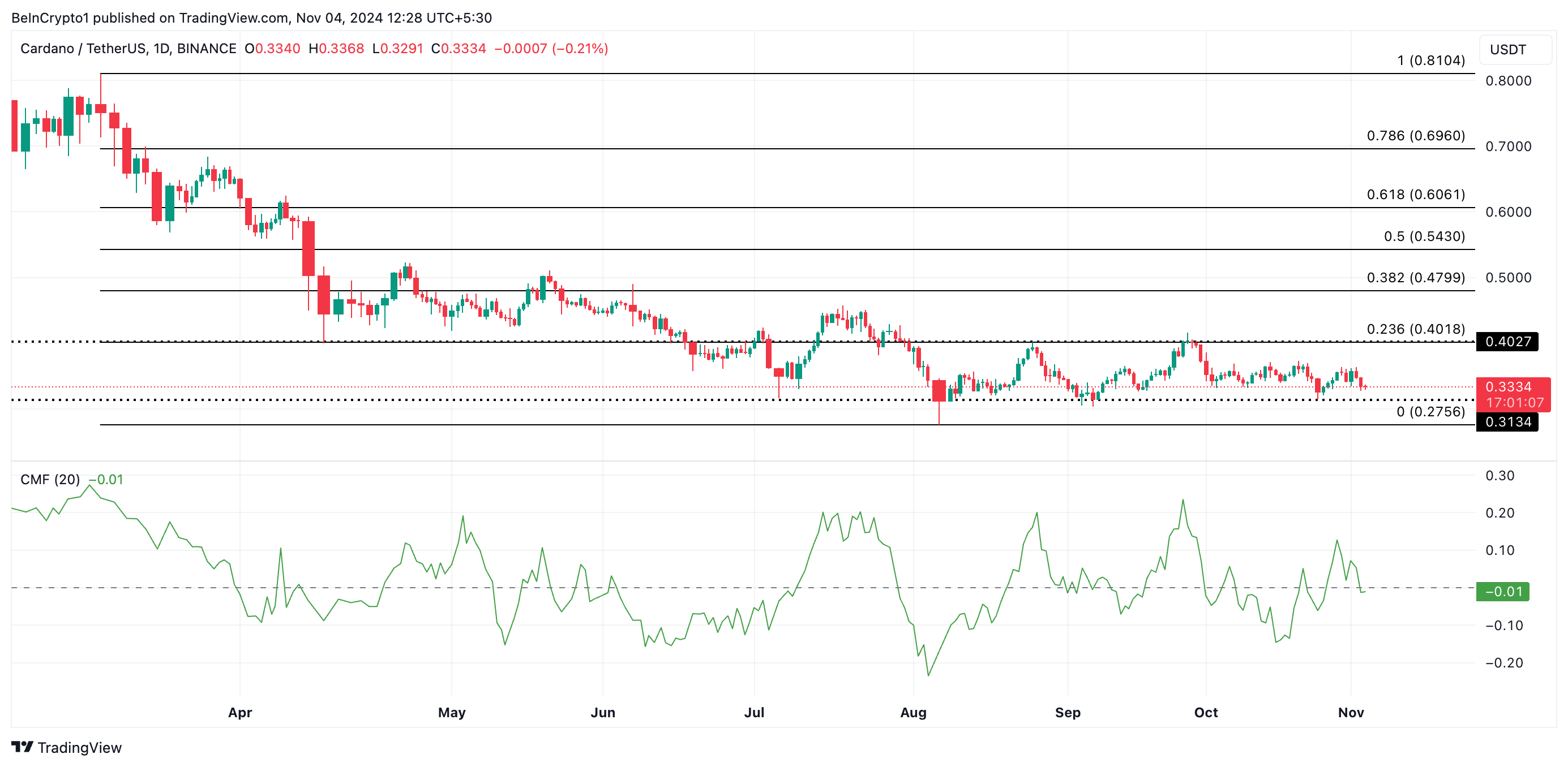 Op het moment van schrijven handelt Cardano op $0,33. Het zweeft iets boven zijn vastgestelde steunniveau van $0,31. Afnemende koopdruk, zoals weerspiegeld door ADA’s negatieve Chaikin Money Flow (CMF)-indicator, suggereert een mogelijke beweging naar beneden richting deze steun. Op dit moment staat ADA’s CMF op -0,01, wat aangeeft dat verkoopactiviteit de koopdruk overtreft.