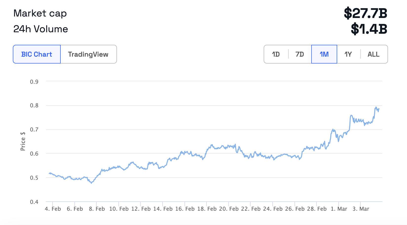 De marktwaardering van Cardano is nu $27,69 miljard en het handelsvolume per 24 uur is ongeveer $1,20 miljard. Het handelsvolume is de afgelopen weken consistent gegroeid.