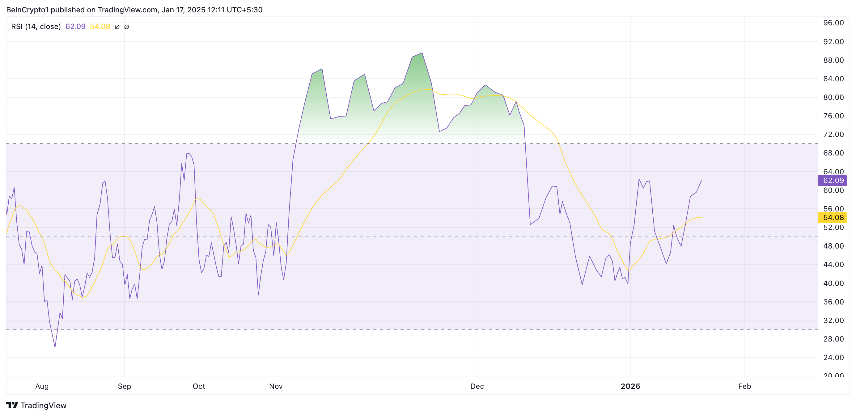 De RSI-indicator meet de overbought- en oversold-marktomstandigheden van een crypto. Het varieert tussen 0 en 100, waarbij waarden boven 70 aangeven dat de coin overbought is en een correctie nodig heeft. Omgekeerd geven waarden onder 30 aan dat de cryptomunt oversold is en mogelijk een herstel kan zien.