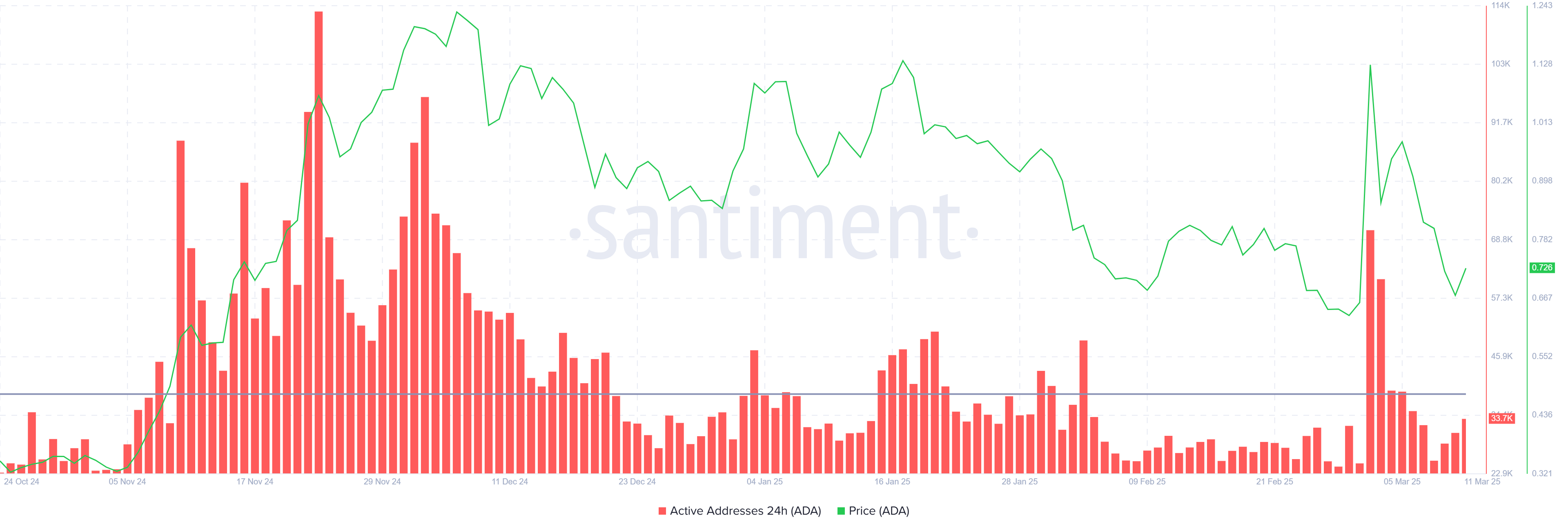 Het algemene macro-momentum voor Cardano is ook beïnvloed door afnemende deelname. Actieve adressen op het netwerk liggen momenteel onder de gemiddelde drempel van 38.600, met een aantal van 33.700. Deze afname in actieve adressen duidt op een daling in investeerdersdeelname en vertrouwen.