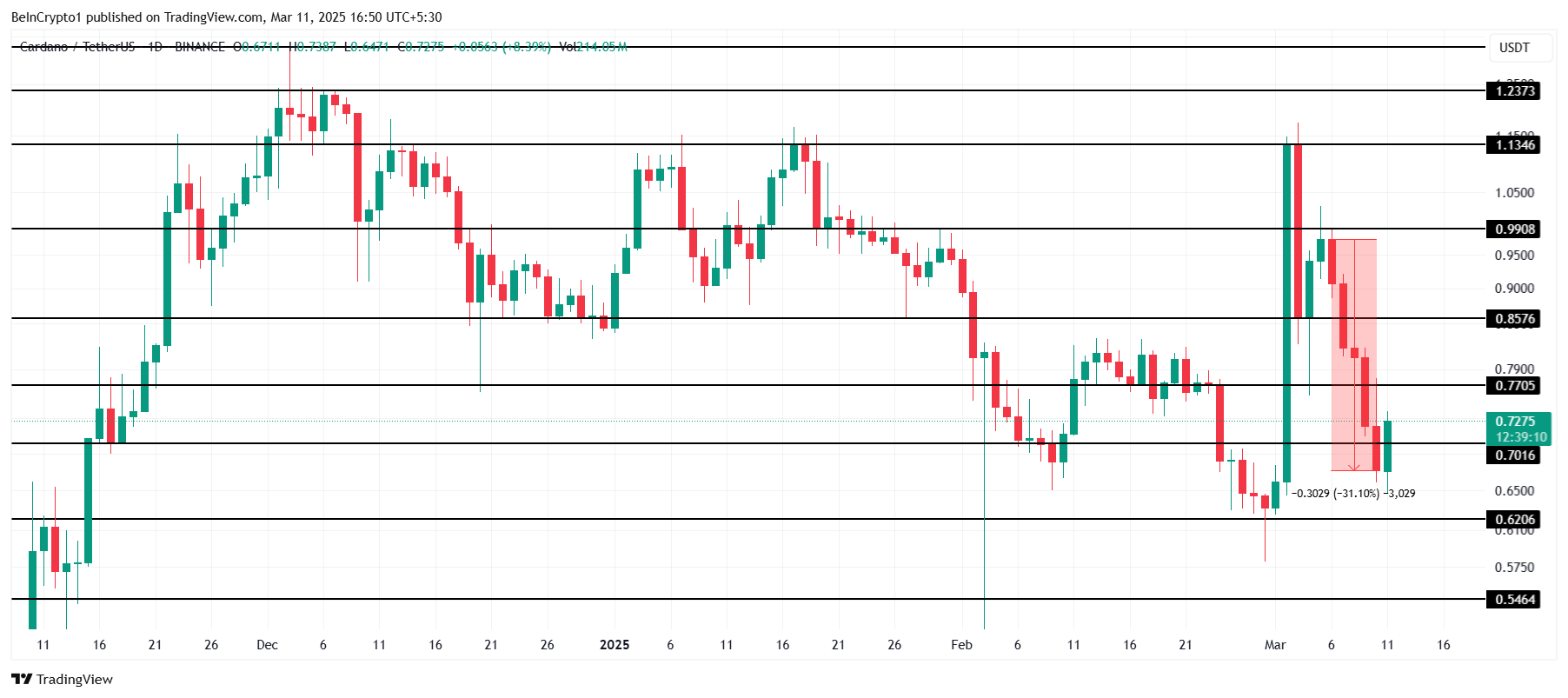 Cardano koers staat momenteel op $0,72 na een daling van 31% in de afgelopen dagen. Deze daling volgde op ADA’s falen om het $0,99-niveau te doorbreken en om te zetten in steun. Het onvermogen om dit kritieke weerstandsniveau te heroveren heeft geleid tot verdere verliezen, en ADA heeft nu moeite om te herstellen.