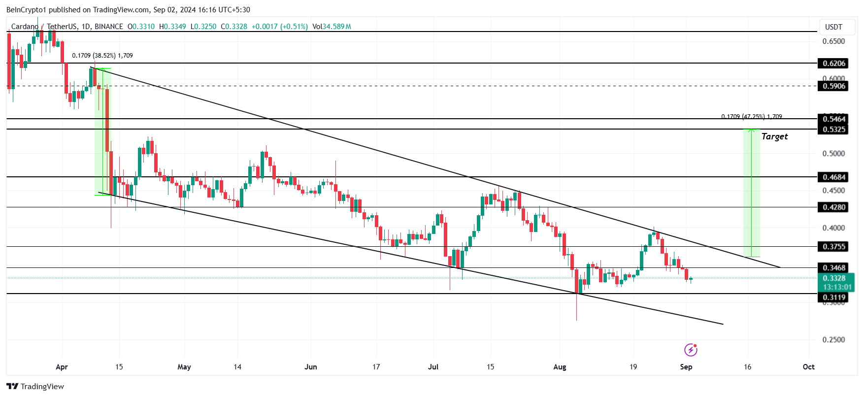 Sponsored SponsoredEchter, voor nu zal de koers van Cardano waarschijnlijk een daling naar de steun van $0.31 noteren. Dit niveau heeft gediend als een cruciale steunvloer, en herstel vanaf dit punt zou ADA kunnen helpen uitbreken. Het patroon suggereert een stijging van 47% na het doorbreken van de dalende wig, met een doel van $0.53.