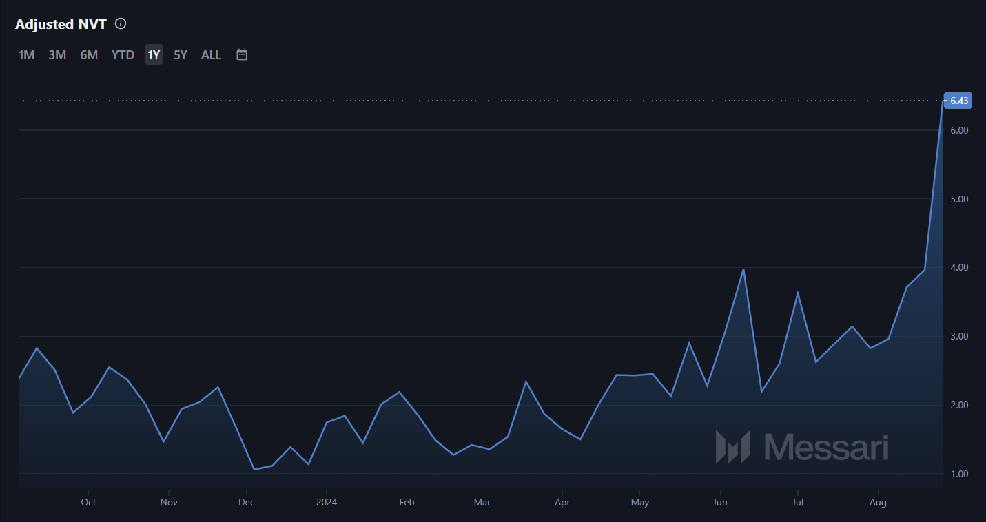 De NVT-ratio, die de relatie meet tussen de marktkapitalisatie van een cryptocurrency en het transactievolume, wordt vaak gebruikt om te bepalen of een cryptomunt overgewaardeerd of ondergewaardeerd is. Momenteel staat deze indicator op een jaarlijks hoogtepunt van 6,43.