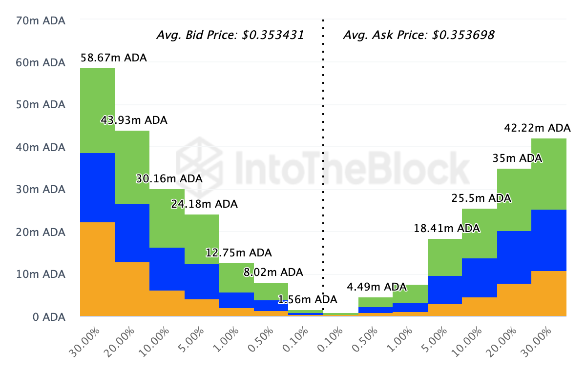 Zoals hieronder te zien is, hebben marktdeelnemers kooporders geplaatst voor 180 miljoen tokens tegen $0,35, wat neerkomt op $63 miljoen tegen de huidige koers. Aan de andere kant willen verkopers 134 miljoen ADA verkopen, met een waarde van bijna $47 miljoen.