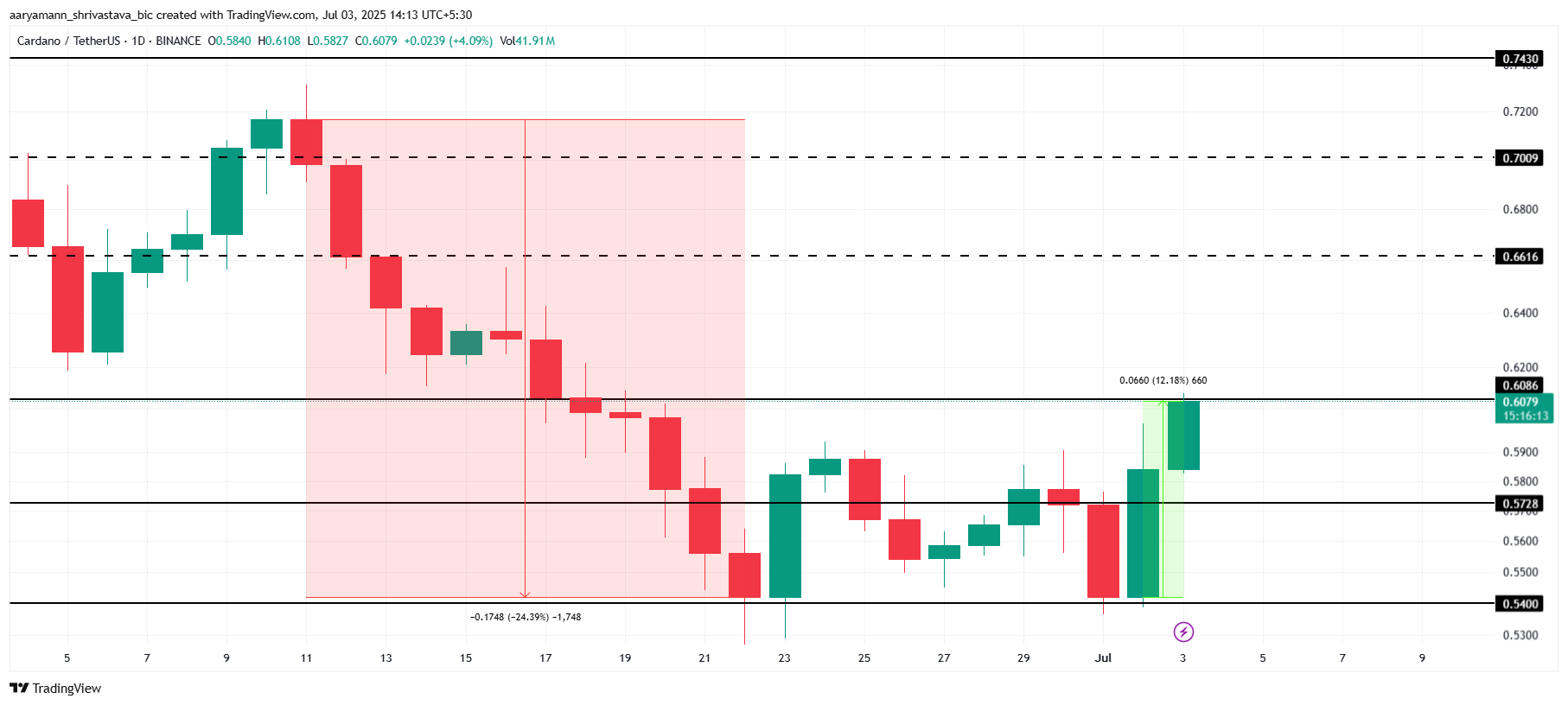 Cardano koers is de afgelopen 24 uur met 12% gestegen, wat ADA-houders hoop biedt op herstel na een verlies van 24% in juni.
