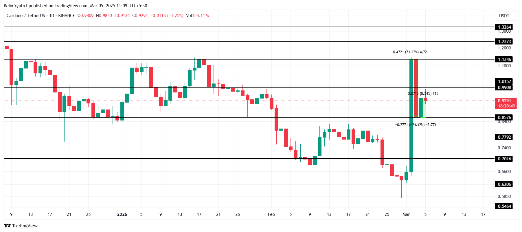 Cardano wordt momenteel verhandeld op $0,92, een stijging van 8% in 24 uur na een eerdere 24% daling op maandag. Het blijft echter onder de cruciale $0,99-weerstand, een sleutelbarrière voor verdere stijging.