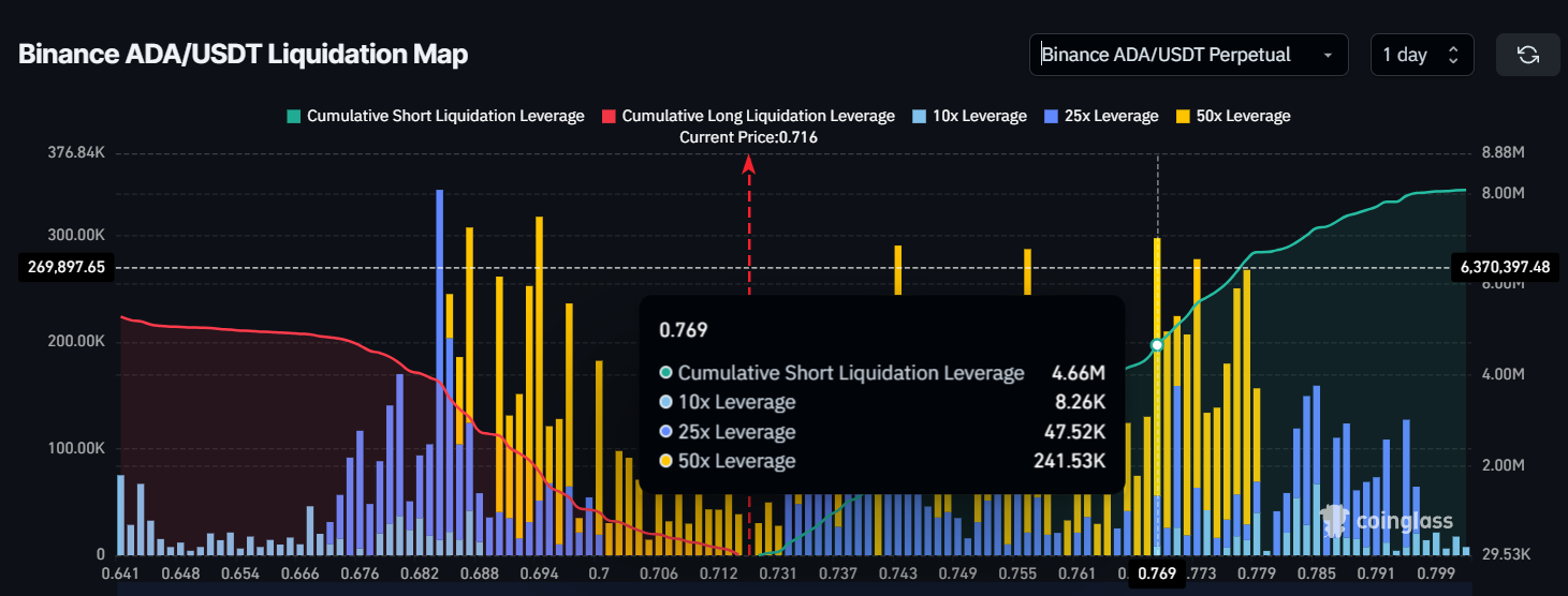 Een beslissende doorbraak boven $0,77 zou het momentum in het voordeel van kopers kunnen kantelen. Als ADA deze weerstand omzet in steun, kan dit een short squeeze veroorzaken, wat liquidaties zou triggeren en een mogelijke rally naar $0,85 kan aanwakkeren. Dit niveau is cruciaal voor ADA om uiteindelijk de $1,00-grens te bereiken.