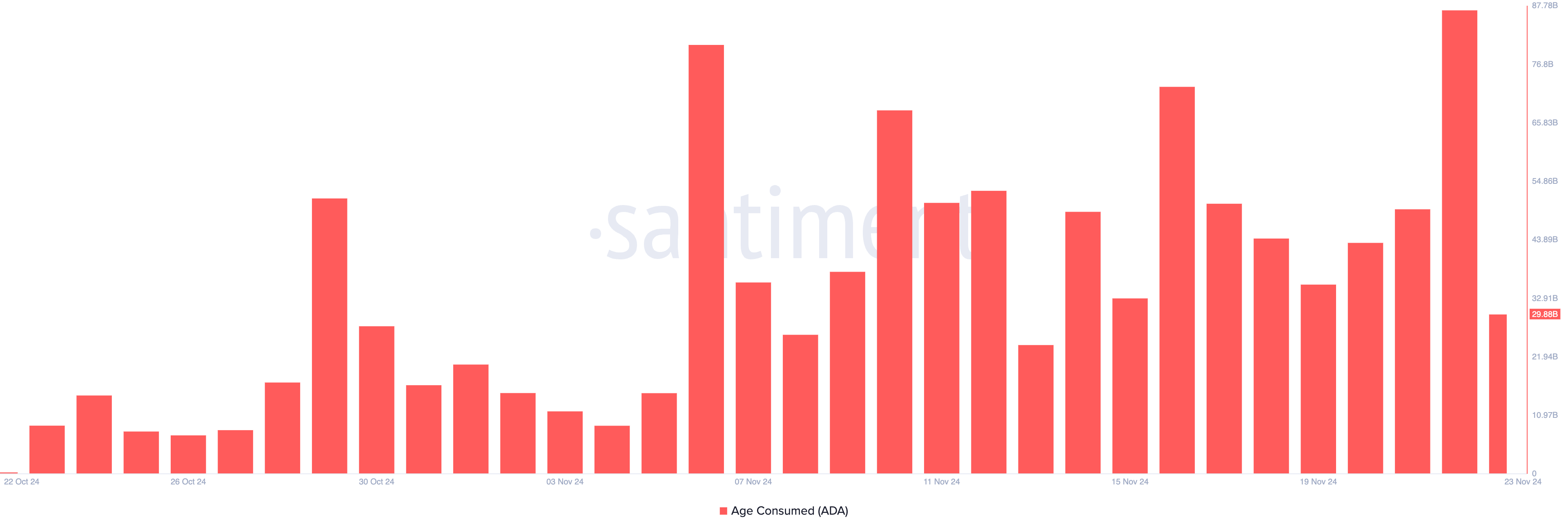 Opmerkelijk is dat nu veel adressen ongerealiseerde winsten hebben, langetermijnhouders (LTH’s) van ADA zich herpositioneren, mogelijk om winsten veilig te stellen. Deze activiteit wordt weerspiegeld door de piek in ADA’s age-consumed-metriek, die volgens de gegevens van Santiment op 22 november naar een maandelijkse high van 86,91 miljard steeg, toen de opwaartse trend begon.