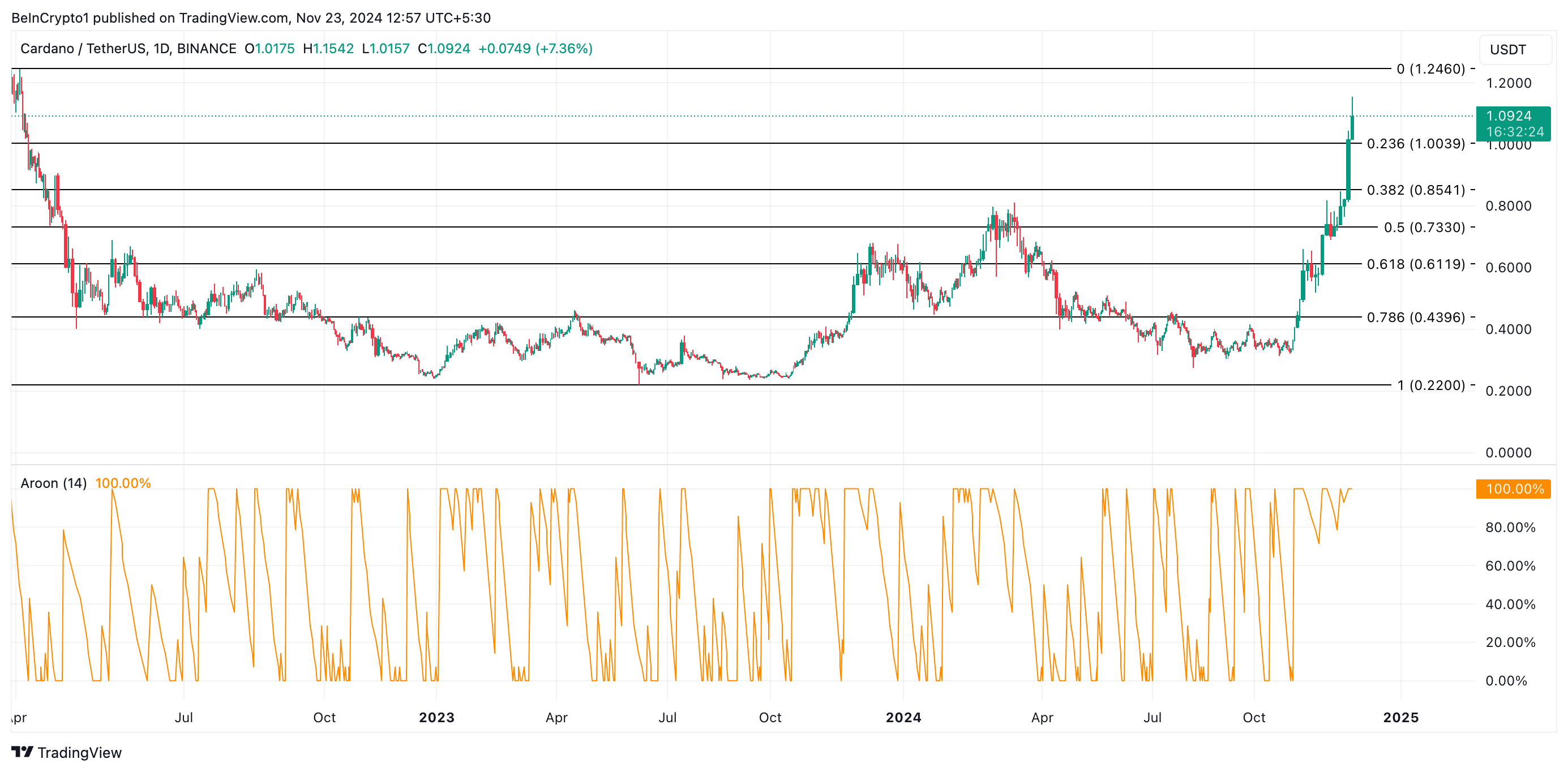 Op de dagelijkse grafiek staat ADA’s Aroon Up Line op 100%. De Aroon-indicator meet de sterkte en richting van een trend. Wanneer de Aroon Up-lijn op 100% staat, duidt dit op een sterke opwaartse trend, wat wijst op een recente high en een mogelijke voortzetting van de bullishness.