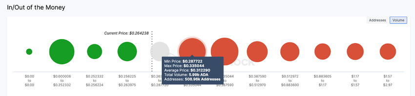 De Global In/Out of the Money data, die alle huidige houders van Cardano groepeert op basis van hun instapkoersverdeling, bevestigt ook deze bullish voorspelling. Het laat zien dat de gigantische sell-wall op $0,30 het grootste obstakel blijft.