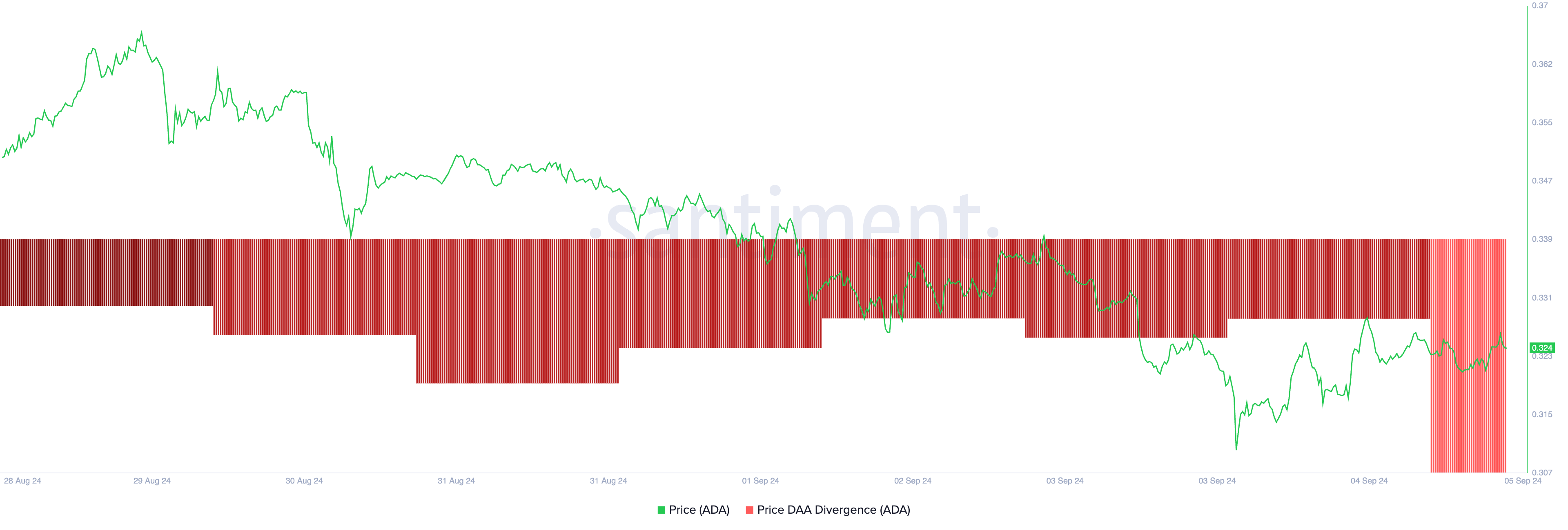 Hoewel dit mogelijk nieuwe vraag naar ADA kan aanwakkeren, moeten handelaren zich ervan bewust zijn dat deze stijging van korte duur kan zijn. Dit wordt bevestigd door de negatieve dagelijkse actieve adres (DAA) divergentie, die op -30,93% staat. Deze indicator meet of de netwerkactiviteit de koersbeweging ondersteunt, en suggereert op dit moment een gebrek aan sterke ondersteuning voor de prijsstijging.